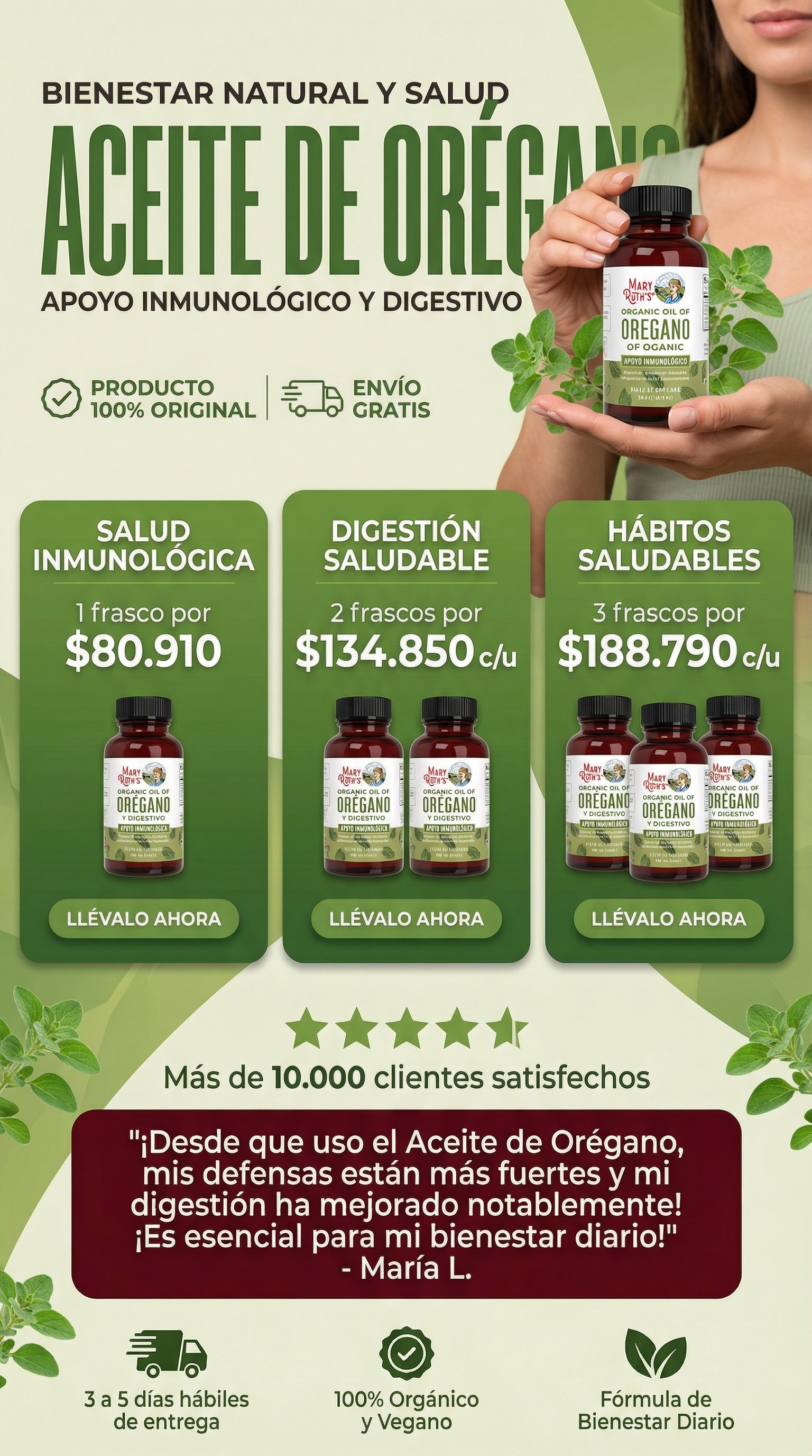 El aceite de orégano orgánico de MaryRuth's es un suplemento líquido potente, certificado por el USDA, vegano y sin alérgenos, diseñado principalmente para fortalecer el sistema inmunológico y apoyar la salud digestiva. Rico en antioxidantes, este extracto natural ayuda a combatir infecciones, mejora la función respiratoria y equilibra la flora intestinal. Aquí se detallan sus beneficios y características principales: